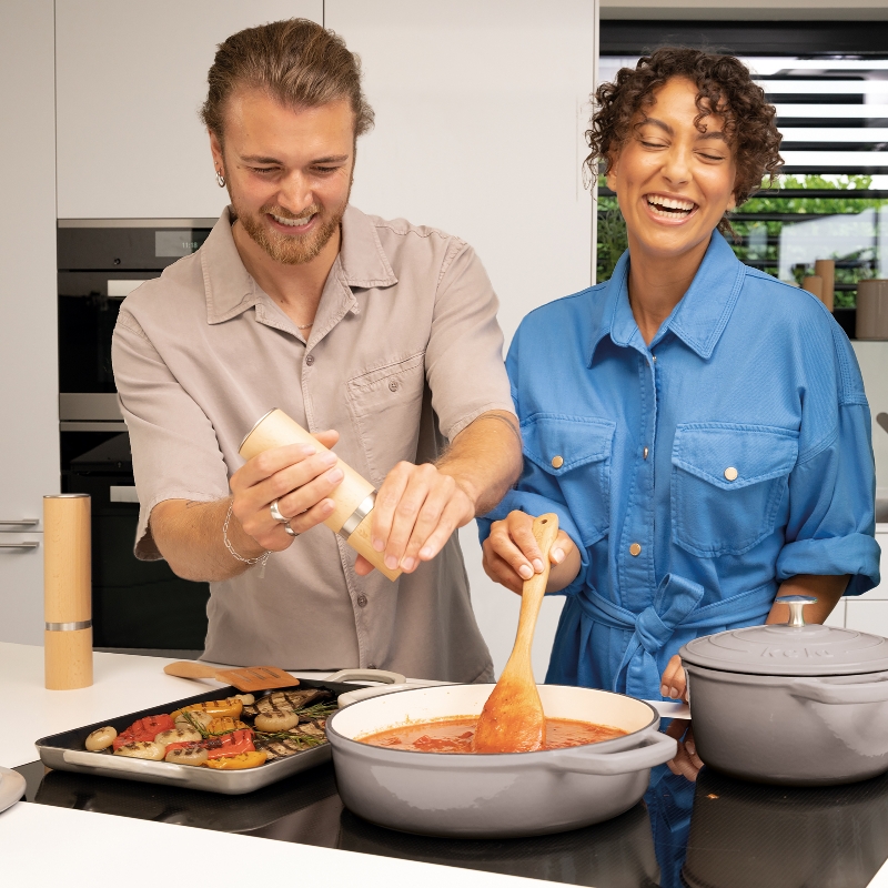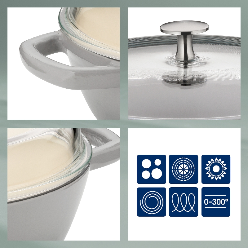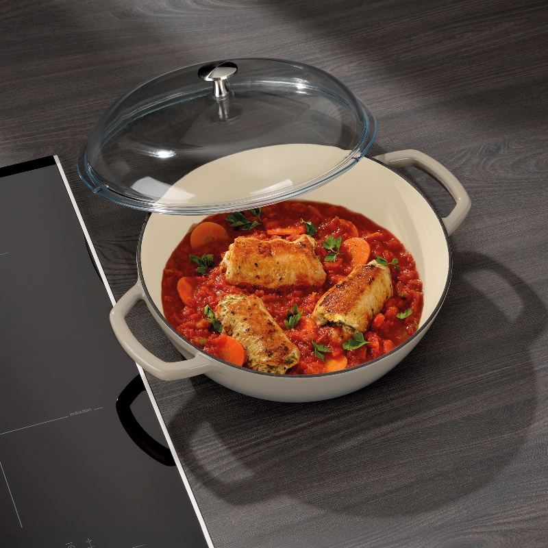 KELA Calido 3,8 l soteynigi oshxonadagi ishonchli yordamchingiz bo‘ladi: unda avval ingredientlarni kuchli olovda qizartirib, so‘ng qopqoq ostida sekin pishirib, taomni suvli va to‘yimli holatda tayyorlash mumkin. Cho‘yan “uy pechi” effektini yaratadi — issiqlikni saqlab, taomni aralashmasdan pishirishga imkon beradi.