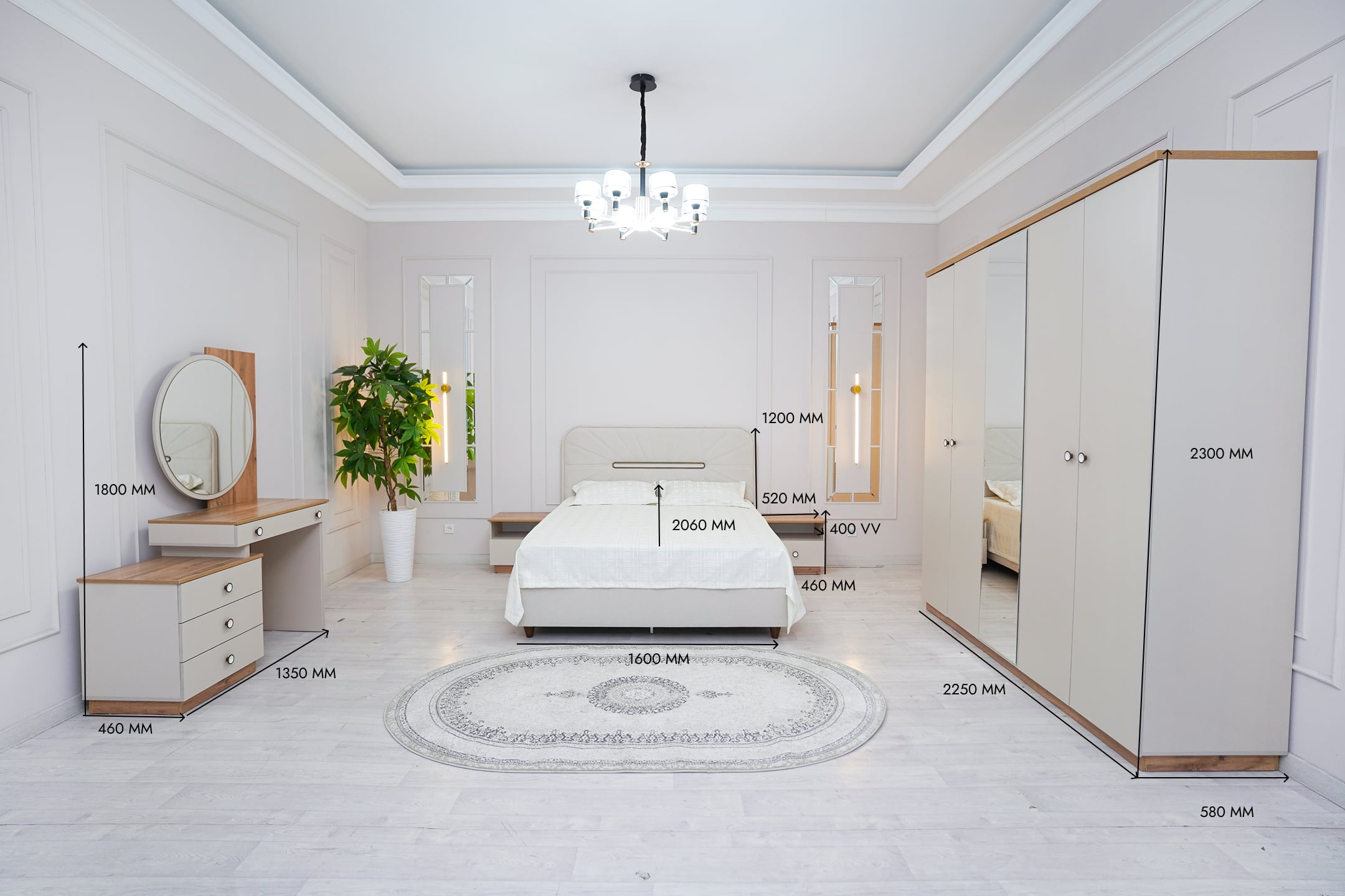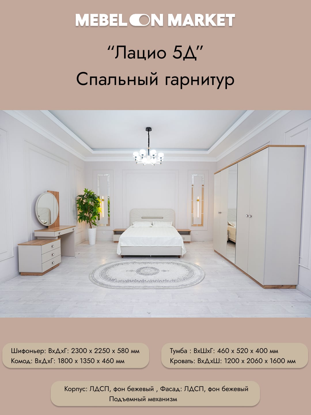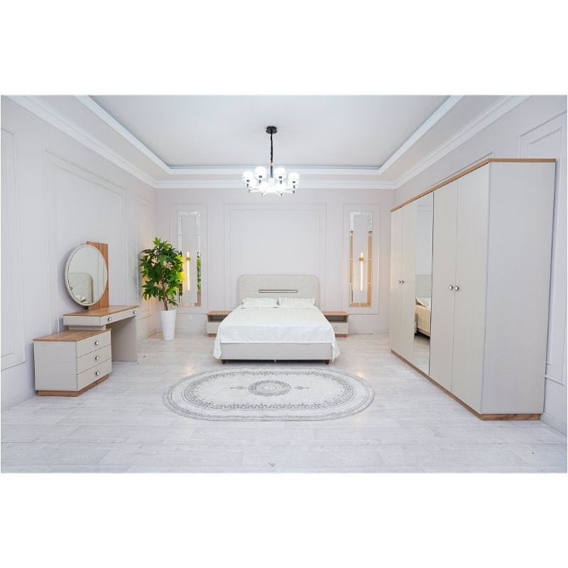 Grand Miks tomonidan ishlab chiqarilgan “Latsio 5D” yotoqxona garnituri — hashamat, zamonaviylik va qulaylikni birlashtirgan mukammal yechim. Mebel yuqori sifatli Rossiya plitasidan tayyorlangan bo‘lib, iliq bej rang interyerni yanada shinam va nafis ko‘rsatadi. Minimalistik yoki klassik uslublarga bemalol mos tushadi.