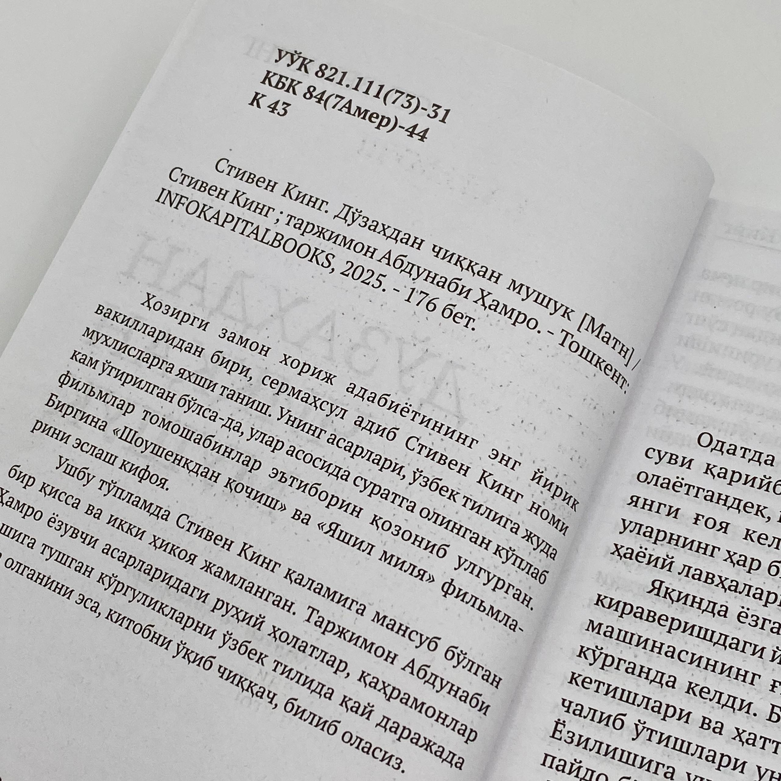 Ishlab chiqaruvchidan 1 yil kafolat. Mahsulotni 10 kun ichida qabul qilamiz va darhol pulni qaytaramiz.Hozirgi zamon xorij adabiyotining eng yirik vakillaridan biri, sermaxsul adib Stiven King nomi muxlislarga yaxshi tanish. Uning asarlari, o'zbek tiliga juda kam o'girilgan bo'lsa-da, ular asosida suratga olingan ko'plab filmlar tomoshabinlar e'tiborini qozonib ulgurgan.