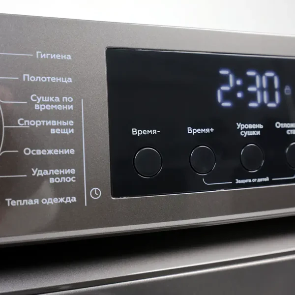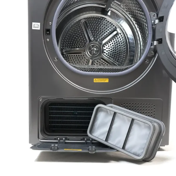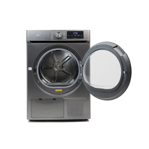 Elegant kulrang dizayn va elektron boshqaruv paneli rejimni tanlashni qulay qiladi. Issiqlik nasosi (Heat Pump) va kondensatsion texnologiya yumshoq quritish, minimal energiya iste’moli va mato sifatini saqlashni ta’minlaydi.
