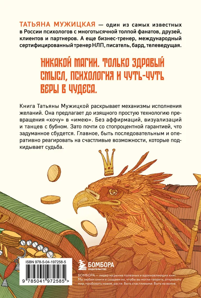 От издателя До Татьяны Мужицкой существовало два подхода к осознанному исполнению желаний. Первый - ставь четкие цели и достигай их. Второй - рисуй карты желаний, посылай запросы Вселенной и жди, что она откликнется. По отдельности и тот, и другой методы нередко давали сбои. Сосредоточенные на цели рационалы часто игнорировали счастливые возможности, которые подбрасывала им судьба. А увлеченные аффирмациями мечтатели так и не приступали к настоящей работе. Более двадцати лет ведения психологических тренингов и консультаций натолкнули Татьяну Мужицкую на мысль, что ключ к бесперебойному исполнению желаний лежит в объединении двух подходов: рационального и иррационального. Плюс - в устранении психологических ограничений, сидящих в головах большинства из нас. Другими словами, разрешению мечтам сбываться. Сегодня Татьяна регулярно получает благодарные отзывы от участников ее тренингов по исполнению желаний. Кто-то благополучно вышел замуж, кто-то обзавелся делом мечты, кто-то купил дом у моря, кто-то уехал жить в теплые страны, родил детей, разбил сад и посадил сотню апельсиновых деревьев. Сама Татьяна, пользуясь своей методикой, сумела воплотить в реальность невероятную для городского жителя мечту - она купила дом на острове Ольхон и создала на его базе тренинговый центр "Дом Совы на Ольхоне". Так что поговорка "сапожник без сапог" - это точно не про Татьяну! Об авторе Татьяна Мужицкая - один из самых известных в России психологов с многотысячной толпой фанатов, друзей, клиентов и партнеров. А еще бизнес-тренер, международный сертифицированный тренер НЛП, писатель, бард, телеведущая. Для кого эта книга Как сказал Радислав Гандапас после ее прочтения, "для людей вроде меня: рациональных и приземленных, но которые верят в чудеса - исполнение своих желаний". А еще для всех, у кого эти желания есть. Или хотя бы есть желание обзавестись заветным желанием, ведь книга Татьяны Мужицкой не только учит воплощать в жизнь свои мечты, но и помогает начать мечтать. Фишки книги С помощью декартовых координат Татьяна Мужицкая выделяет четыре зоны, лежащие в основе исполнения любого желания. Она призывает последовательно прокачивать каждую из зон и объясняет, как это сделать - с конкретными рекомендациями и практическими упражнениями. По мнению Татьяны, именно в отсутствии внимания к одной или нескольким зонам кроется фатальная "несбываемость" желаний. Отзывы на книгу "После каждой встречи с Татьяной Мужицкой хочется расправить крылья, изменить свою жизнь и весь мир. Эта книга не исключение - пошагово и человеческим языком здесь описаны те действия и размышления человека, которые приведут его к исполнению заветных мечт. Читайте, друзья, вдохновляйтесь и, главное - Желайте! Желайте правильно!" - Максим Батырев, известный российский менеджер, входит в Топ-100 лучших менеджеров России, по версии ИД "КоммерсантЪ", автор бестселлеров "45 татуировок менеджера", "45 татуировок личности" и др. "Книга Татьяны Мужицкой - четкая и исчерпывающая инструкция для людей вроде меня: рациональных и приземленных, но которые верят в возможность чуда". - РАДИСЛАВ ГАНДАПАС, бизнес-тренер, президент Ассоциации спикеров СНГ, автор бестселлеров "Камастура для оратора", "Харизма лидера", "Полная Ж. Жизнь как бизнес-проект"