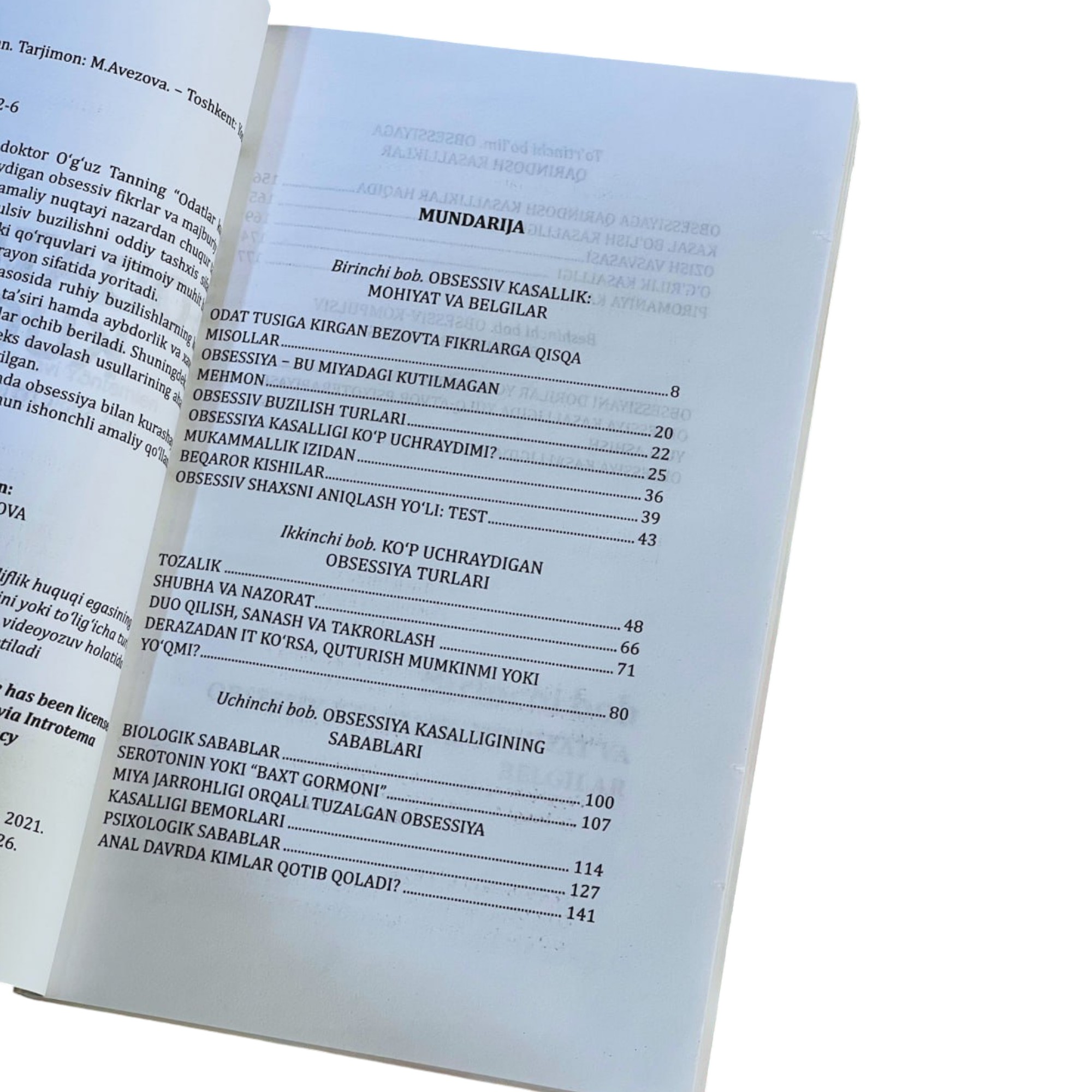 Bu kitobda obsessiv fikrlar va majburiy xatti-harakatlar oddiy “kasallik” sifatida emas, balki insonning ichki qo‘rquvlari, hayotiy tajribasi va atrof-muhit bilan bog‘liq murakkab ruhiy jarayon sifatida yoritiladi.