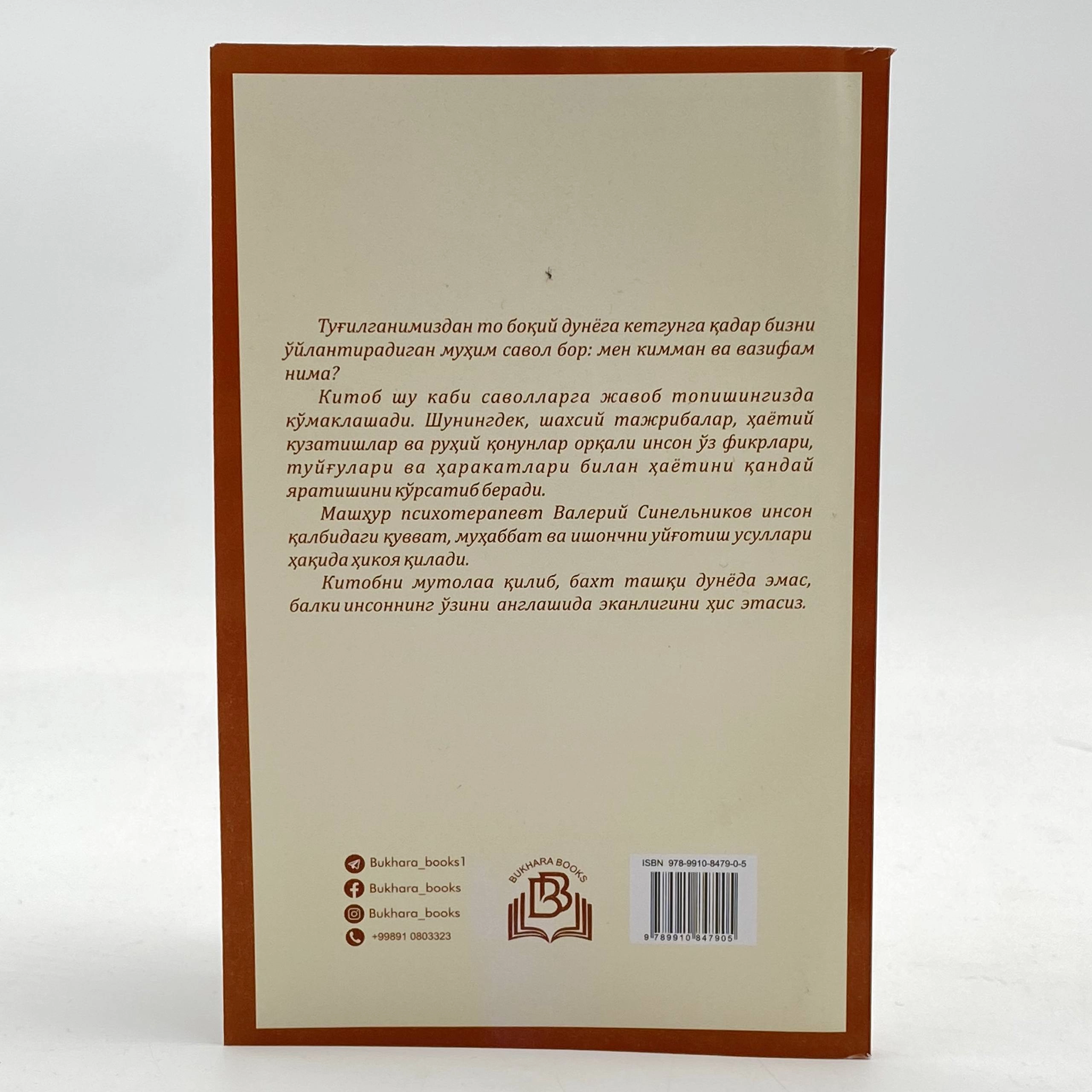 Ushbu kitob esa shu kabi savollarga javob topishingizda ko‘maklashadi. Shuningdek, shaxsiy tajribalar, hayotiy kuzatishlar va ruhiy qonunlar orqali inson o‘z fikrlari, tuyg‘ulari va harakatlari bilan hayotini qanday yaratishini ko‘rsatib beradi. Mashhur psixoterapevt Valeriy Sinelnikov inson qalbidagi quvvat, muhabbat va ishonchni uyg‘otish usullarini ochib beradi. Asar o‘quvchini hayotda sodir bo‘ladigan har bir voqeani o‘zi uchun saboq sifatida qabul qilishga va shundan quvonch topishga chorlaydi.