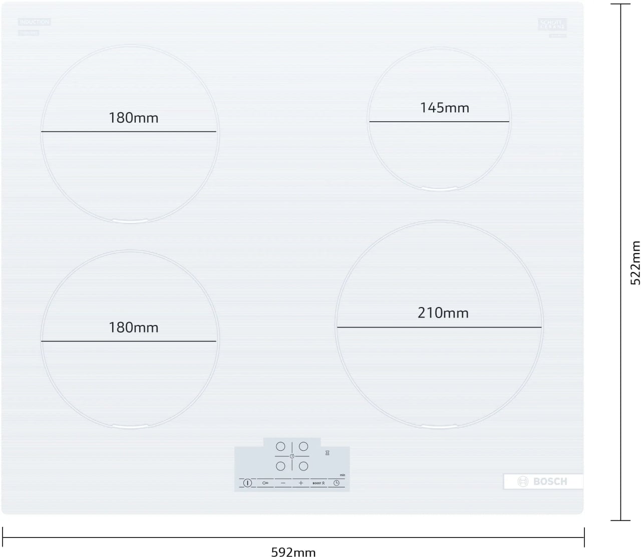 Panel to‘rtta induksion qizdirish zonasi bilan jihozlangan bo‘lib, ularning barchasi bir vaqtda ishlashi mumkin. Umumiy quvvat 4600 Vt ni tashkil etadi. Zonalar konfiguratsiyasiga diametri 18 sm bo‘lgan ikkita, 14,5 sm li bitta va 21 sm li bitta katta zona kiradi, bu esa turli o‘lchamdagi idishlardan qulay foydalanish imkonini beradi. Qizdirish quvvati 1,4 dan 2,2 kVt gacha bo‘lib, kuchaytirish funksiyasi orqali 3,7 kVt gacha yetadi — tez qizdirish va moslashuvchan pishirish uchun ideal.