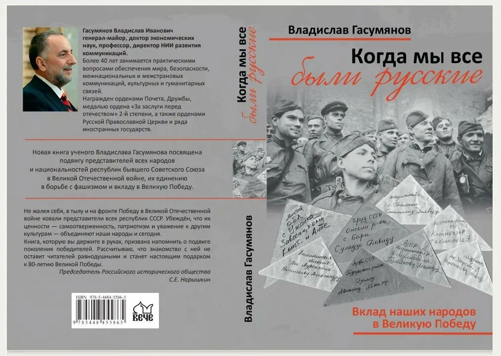 Российский ученый, доктор экономических наук, профессор Владислав Гасумянов посвятил свою книгу подвигу всех народов Советского Союза в Великой Отечественной войне. На основе малоизвестных и впервые публикуемых документов он рассказывает, как сражались Герои Советского Союза, полные кавалеры ордена Славы на всех фронтах, как самоотверженно трудились в тылу представители всех 15 республик СССР. В дни 80-летия Великой Победы и в Год защитника Отечества выпуск в свет такой книги, где впервые собраны материалы и документы о подвигах советских героев , — еще одно напоминание о том, какой ценой нам досталась Победа и как важно помнить об этом.
