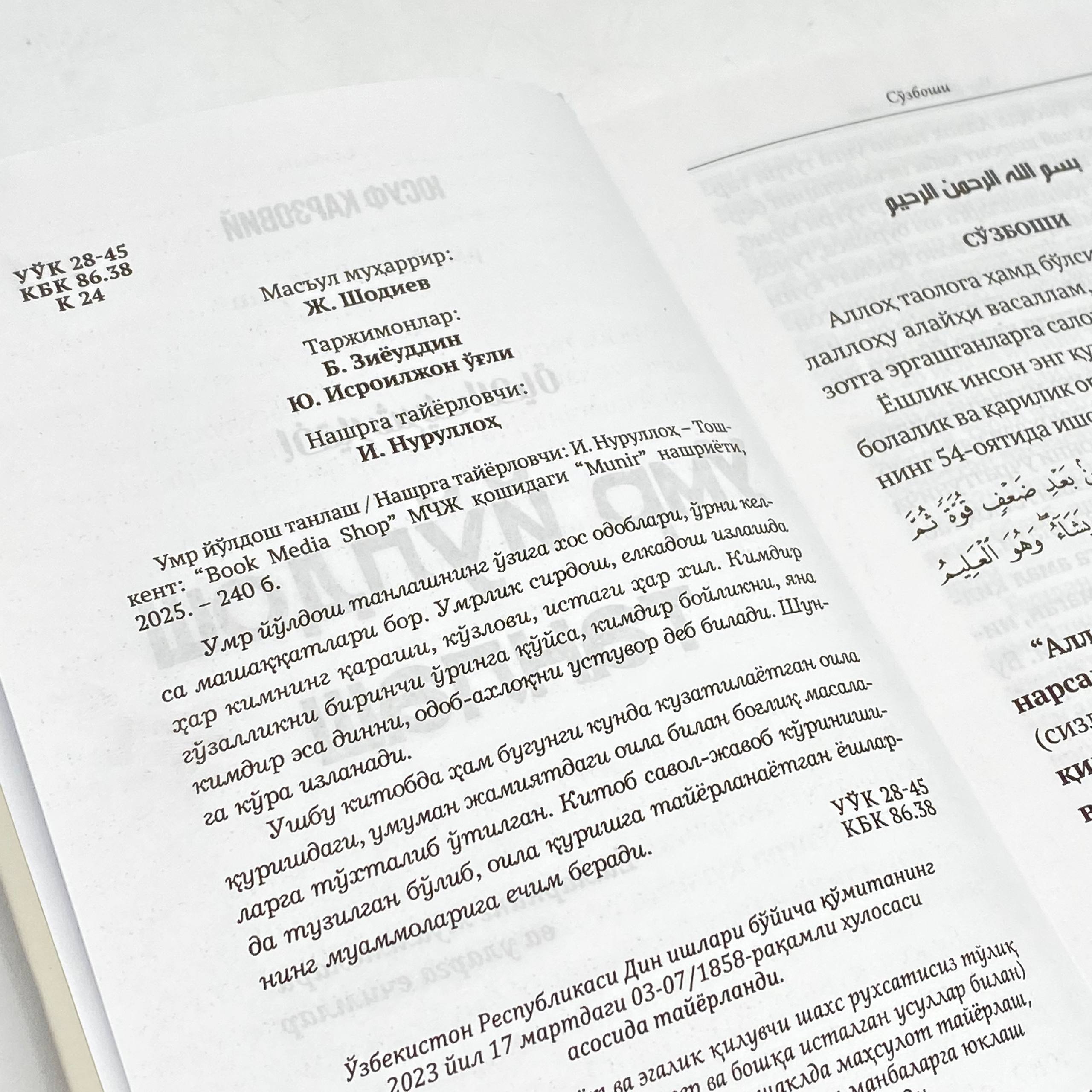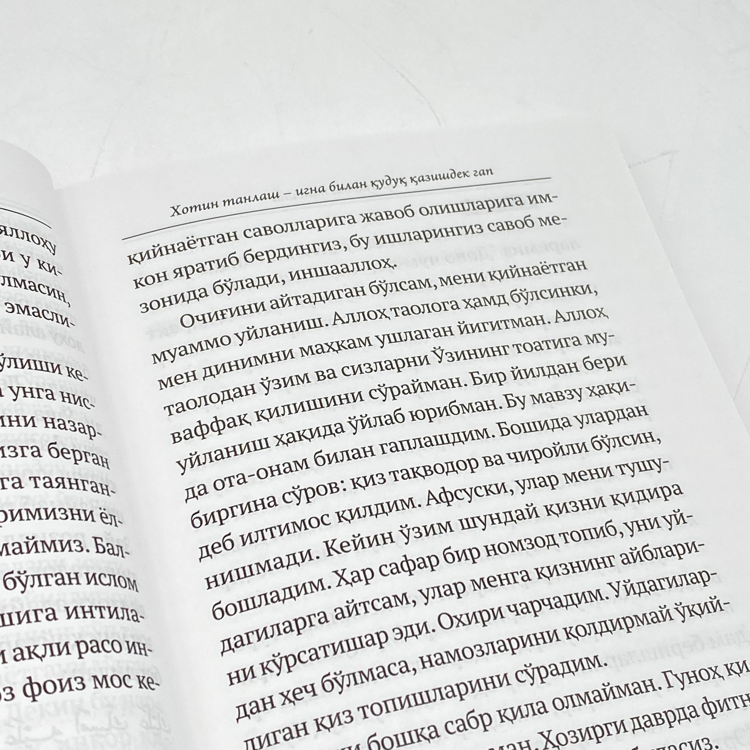 Ushbu kitobda ham bugungi kunda kuzatilayotgan oila qurishdagi, umuman jamiyatdagi oila bilan boglik masalalarga to'xtalib o'tilgan. Kitob savol-javob ko'rinishida tuzilgan bo'lib, oila ko'rishga tayyorlanayotgan yoshlarning muammolariga yechim beradi.