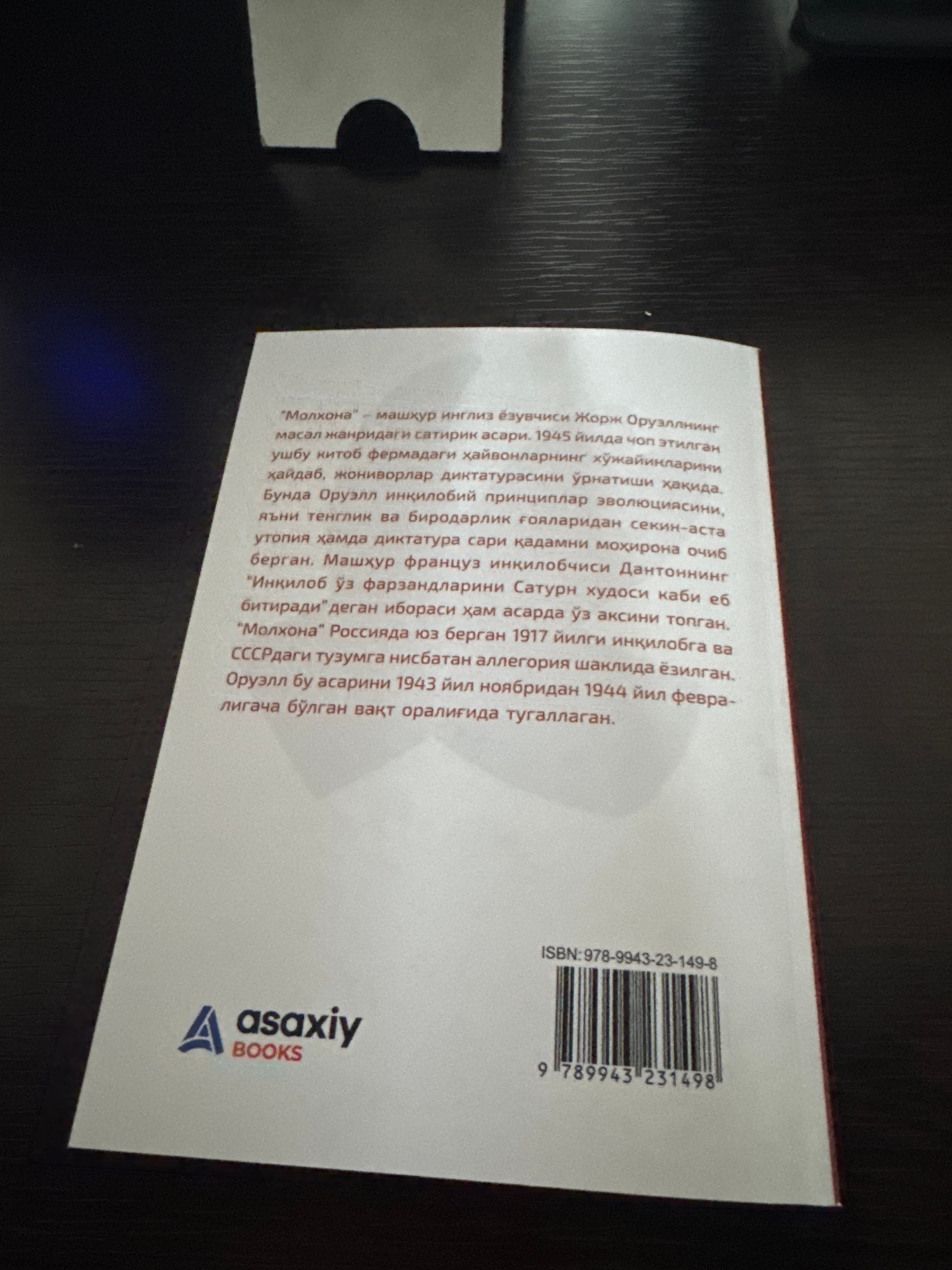Asaxiy.uz doʻkoniga buyurtma berganimda pochta orqali bir haftada yetib keldi . Bu qulayligi. Asar haqida aytsam menga juda ham yoqdi. Asardagi qaxramonlarining hayvon tarzida berilishi boshqa asarlarda bunchalik oʻxshashlik bilan berilmagan. Ayniqsa choʻchqalar hukmronligi odamda boshqacha tasavvur paydo qiladi. Yomon tomonini aytsam baʼzi joylari juda ham boʻrttirib yuborilgan. Odamning choʻchqa qiyofasida berilishi boshqacha taʼsir qiladi. Bu kitobni koʻpchilik olib oʻqishgan. Har bir kishining oʻz fikrlari bordir. Odamga teskari taʼsir ham qilishi mumkin. Hayvonlarning odamlar bilan ziyofat qilish sahnasi.